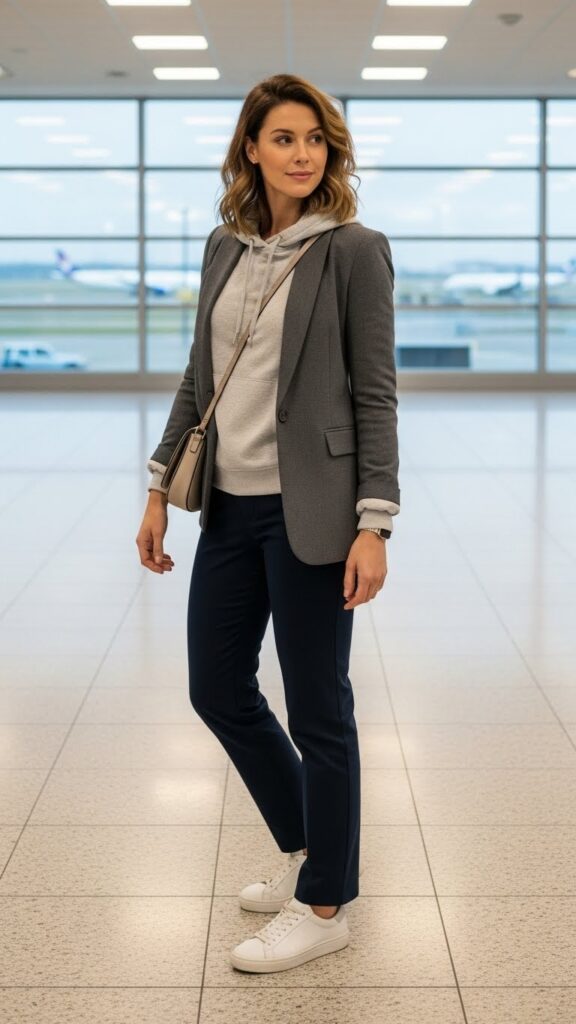This is for my girlies who need to look somewhat professional even while traveling. Throwing a blazer over your hoodie instantly elevates the whole vibe. Pair with straight-leg jeans or tailored joggers and clean white sneakers or loafers. The juxtaposition of the casual hoodie with the structured blazer creates this cool high-low mix that’s very now. Make sure your hoodie is fairly fitted or at least streamlined so you’re not adding too much bulk under the blazer. This outfit is perfect for work trips or when you’re heading straight to dinner after landing. You can ditch the blazer on the plane and still look decent in just the hoodie. Plus, blazers with good pockets are a lifesaver for keeping your boarding pass and ID easily accessible.