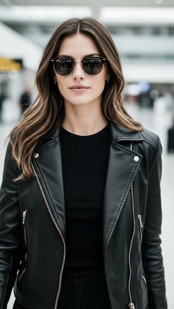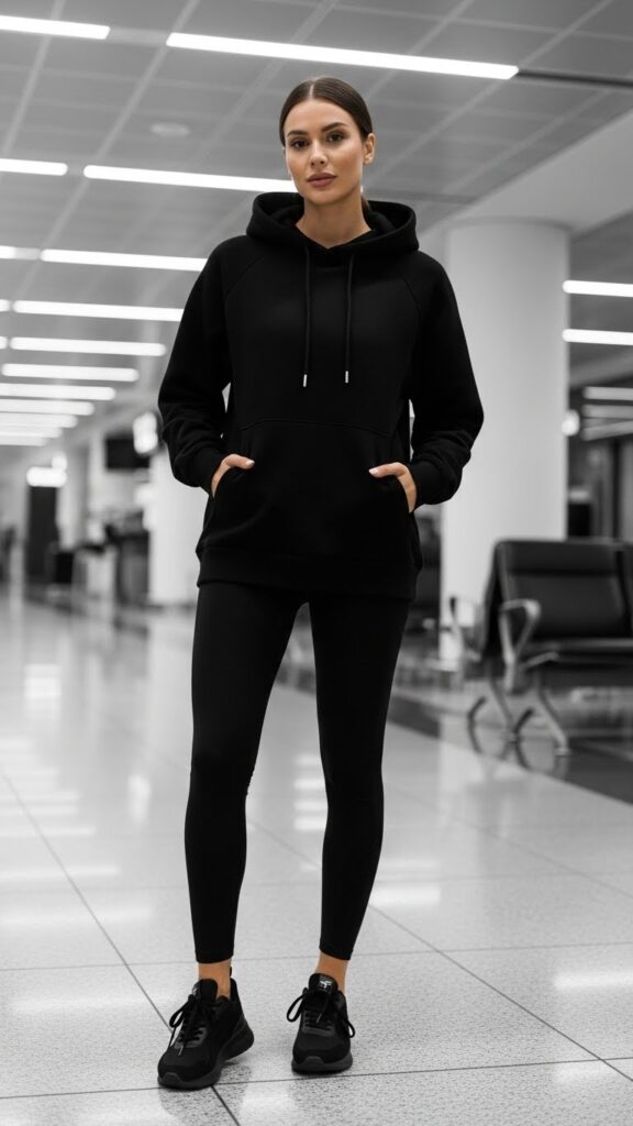 When in doubt, go all black. An all-black ensemble with a black hoodie, black leggings or jeans, and black sneakers is foolproof airport attire. It’s slimming, it hides coffee stains, and it looks expensive even when it’s not. The monochrome approach creates a streamlined silhouette that just works. Elevate this simple combo with interesting textures like a leather jacket layered over the hoodie, or add a pop of color with your bag or shoes if you’re feeling adventurous. Throw on some statement sunglasses and a bold lip, and suddenly your comfy outfit looks runway-ready. This is also the perfect outfit for those late-night or early-morning flights when you literally cannot be bothered to think about color coordination.