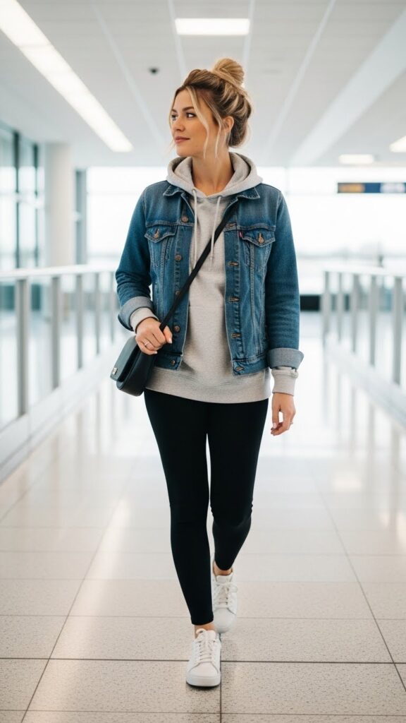 This is the foundation, the blueprint, the outfit we’ve all worn at least seventeen times. But here’s the thing: it works. Pair your favorite oversized hoodie with high-waisted black leggings and some clean white sneakers, and you’ve got yourself an airport uniform that never fails. The key here is making sure your leggings are actually good quality because trust me, cheap leggings on a five-hour flight are nobody’s friend. Look for pairs with a thick waistband that won’t dig in when you’re sitting for hours. Throw on some gold hoops and suddenly you look intentional instead of “I overslept and grabbed the first thing I saw.” This combo is perfect because it travels well, doesn’t wrinkle, and you can literally wear it straight from your Uber to your destination hotel without changing.