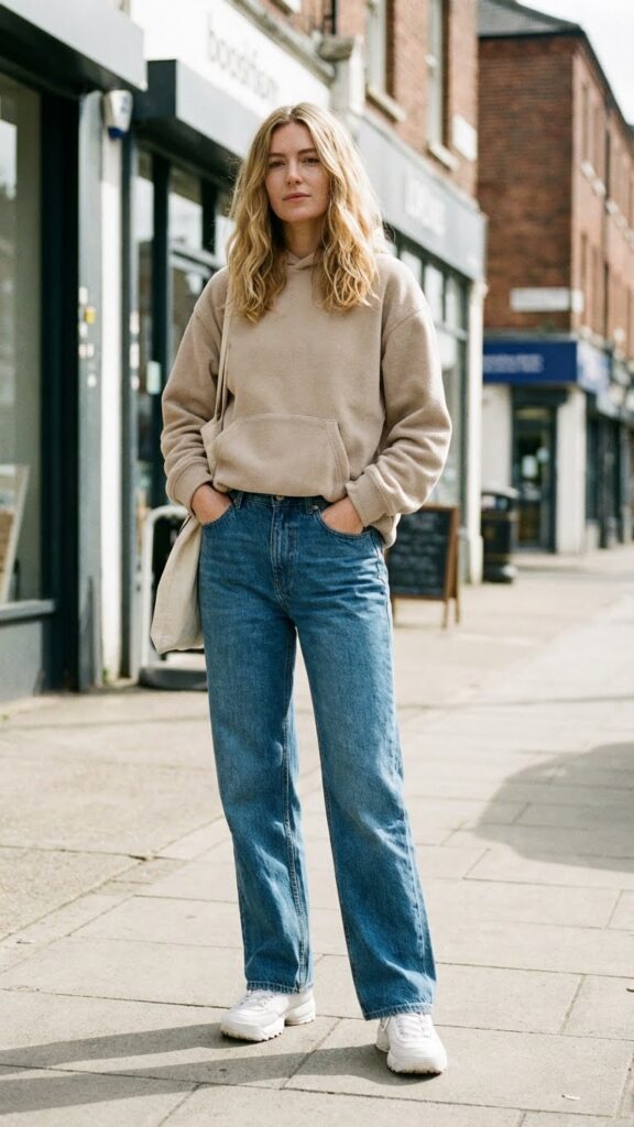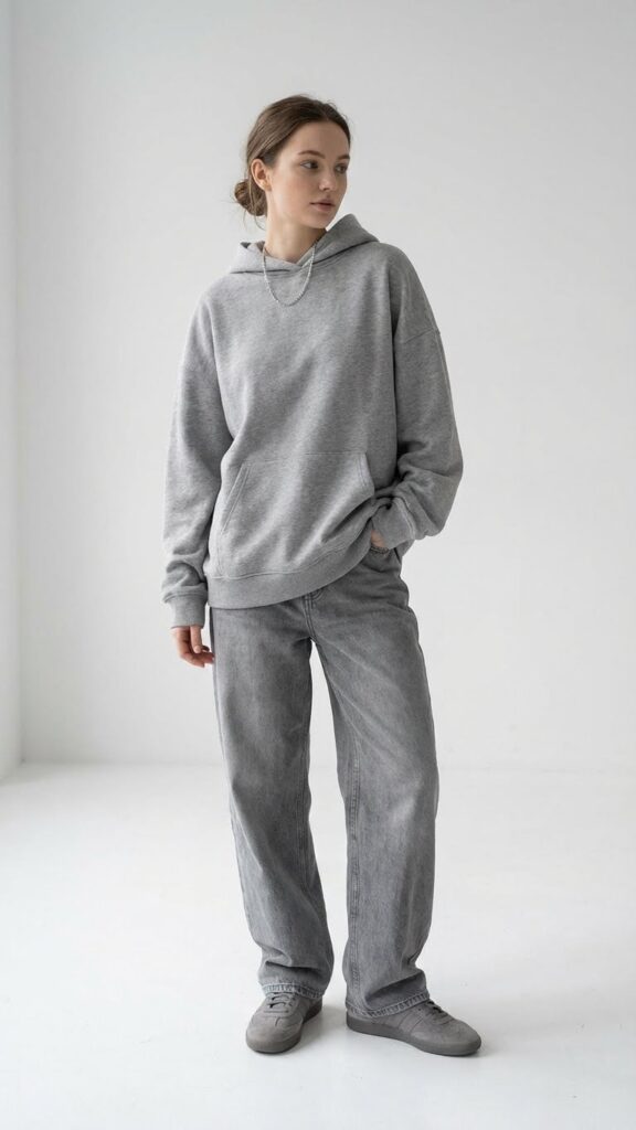 Start with the classic and you can’t go wrong. An oversized hoodie in a neutral shade like beige, gray, or black paired with straight-leg baggy jeans is the foundation of casual cool. The key here is balance: the straight-leg cut keeps things structured enough that you don’t look like you rolled out of bed (even if you did).