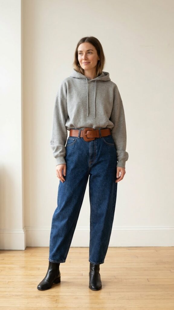 Go for a statement belt with an interesting buckle to make this work. Ankle boots or chunky loafers keep the vibe polished-casual. This is perfect for days when you want the comfort of a hoodie but need to look slightly more put-together. It’s a small styling trick that makes a surprisingly big impact.