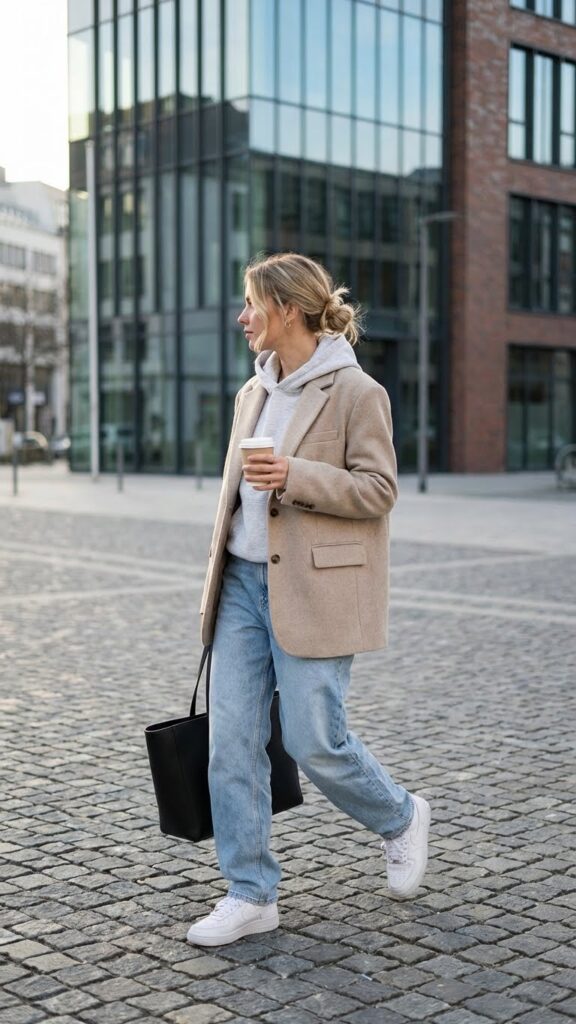 Stick to neutral blazers in black, gray, or camel for maximum versatility. Add white sneakers to keep it casual or swap in loafers for slightly dressier vibes. This outfit works for casual Fridays, lunch meetings, or anytime you need to look semi-professional without sacrificing comfort. It’s honestly genius.