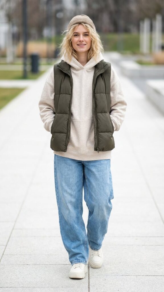 Layering a puffer vest over your hoodie adds warmth and dimension without bulk. This combo works beautifully for transitional weather when it’s not quite cold enough for a full coat but too chilly for just a hoodie. Your baggy jeans keep the bottom half relaxed and comfortable.
