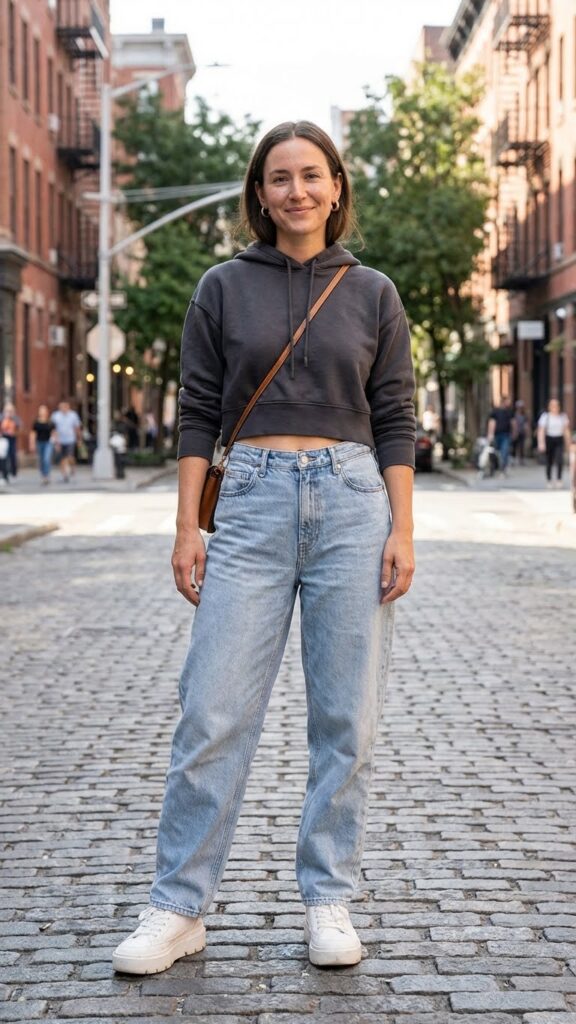 Want to show a little shape while keeping things comfy? Enter the cropped hoodie. This look is chef’s kiss because it gives you that relaxed hoodie energy while the high-waisted baggy jeans create the illusion of legs for days.