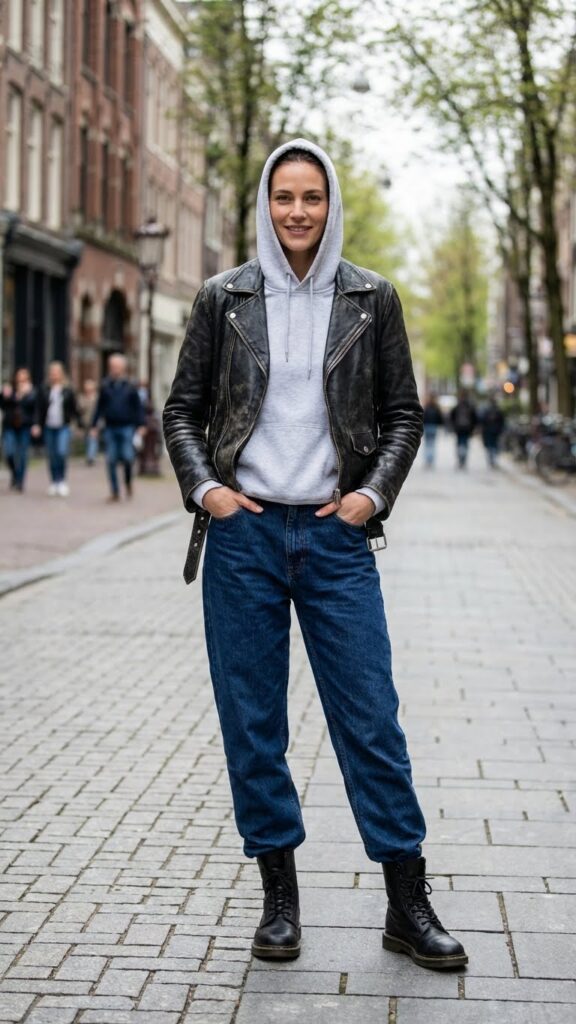 Go for a black or brown leather jacket, keep your hoodie in a complementary neutral, and let your baggy jeans do their thing. Combat boots are my personal choice here because they lean into that cool-girl aesthetic, but white sneakers work too if you want something lighter. This look screams “I have my life together” even if your biggest accomplishment today was remembering to drink water.