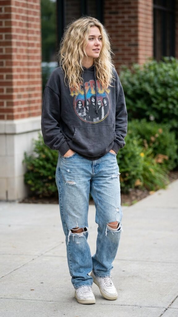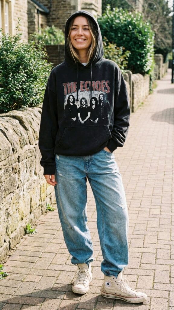 Nothing says effortless cool quite like a vintage band hoodie. Whether it’s an actual thrifted find or one of those perfectly worn-in designs, this look has personality for days. Pair it with light-wash baggy jeans for that nostalgic ’90s energy.