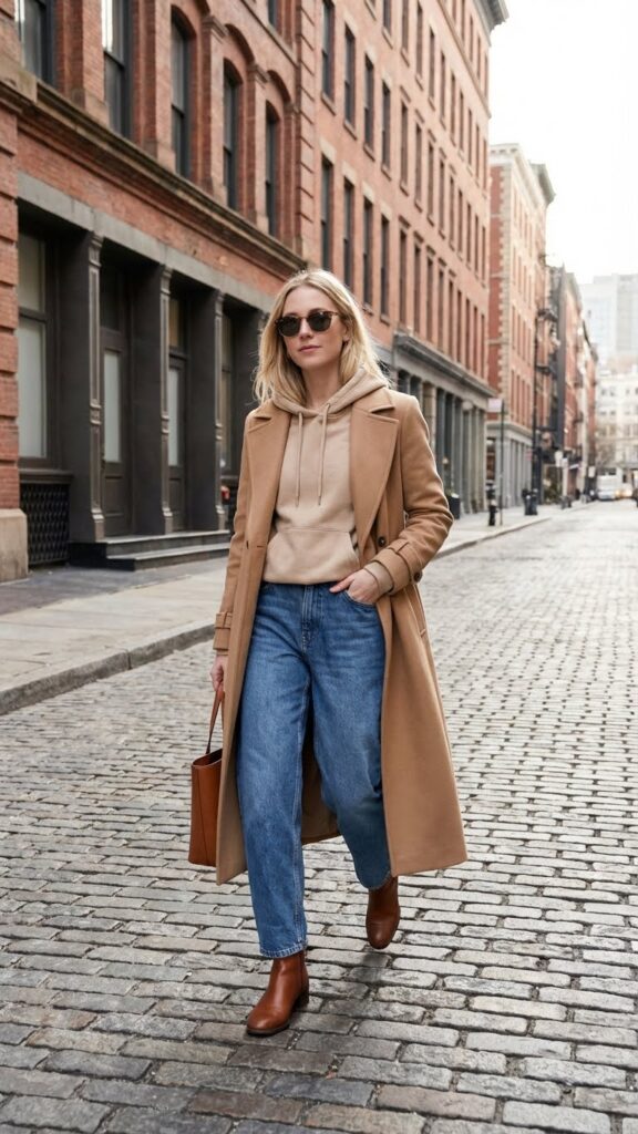 A camel or black trench works best here, creating a polished outer layer while your hoodie and baggy jeans keep things relaxed underneath. Finish with loafers or ankle boots for a sophisticated touch. I love this look for days when I have meetings but refuse to wear anything remotely uncomfortable. It’s the perfect blend of “I’m an adult” and “but also I want to be cozy.”