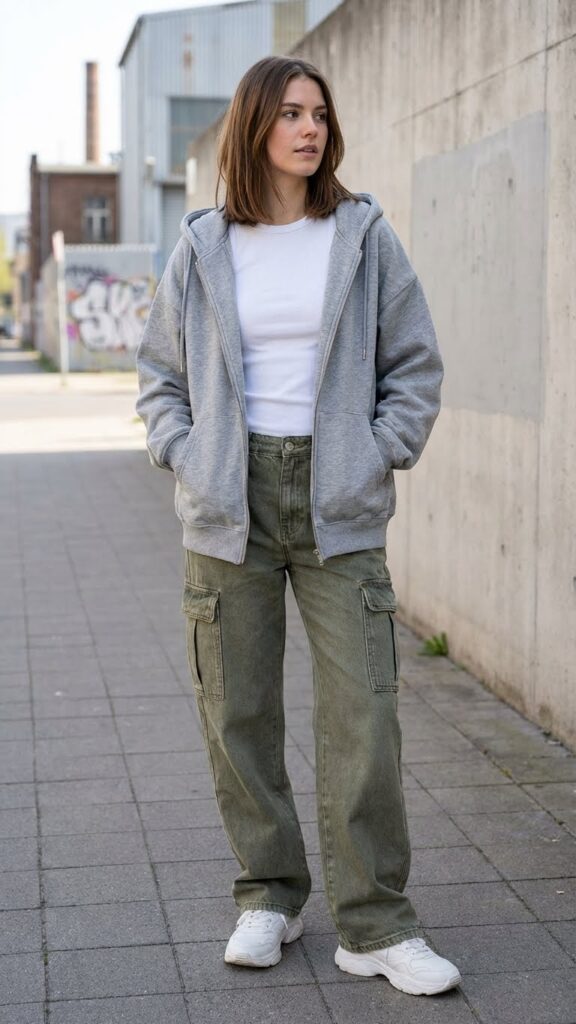 Cargo jeans are having their moment, and honestly, I’m here for it. The utilitarian vibe of baggy cargo jeans paired with a zip-up hoodie gives major streetwear energy without trying too hard. Leave the hoodie unzipped with a simple tank or tee underneath for added dimension.