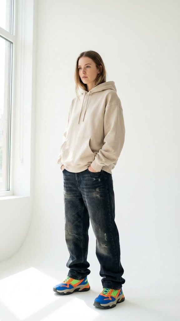 Let’s talk about making your shoes the star of the show. Sometimes your outfit is just a canvas for your favorite sneakers, and that’s totally valid. Keep your hoodie and baggy jeans in neutral tones, then add the most colorful, bold, or unique sneakers you own.