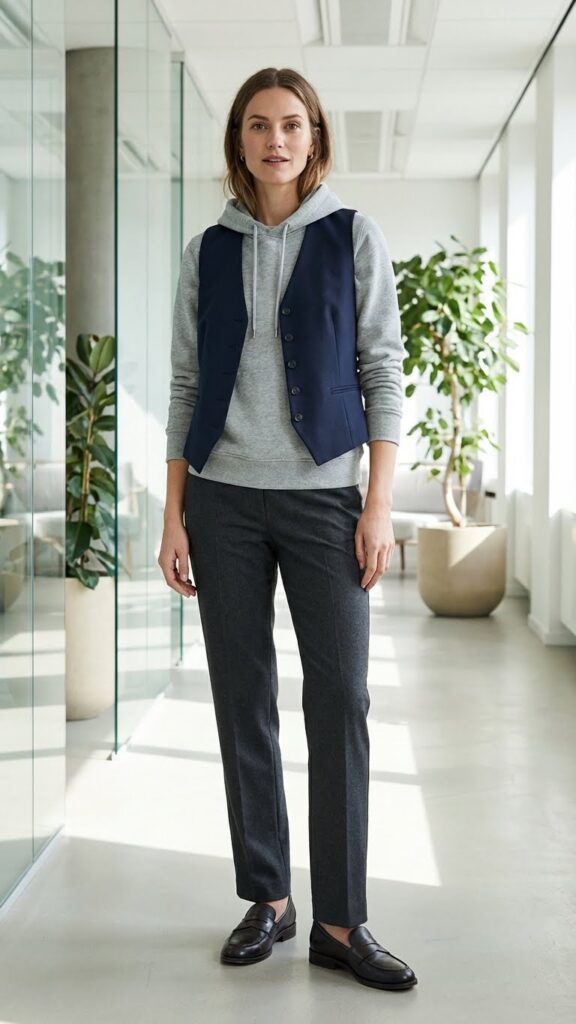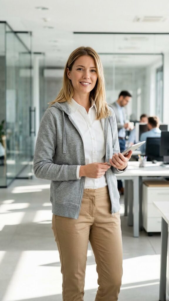Go for a fitted blazer to balance the hoodie’s relaxed vibe. Pair with slim trousers or even dark jeans if your workplace allows. This hoodie office outfit idea is perfect for video calls where you need to look professional from the waist up—and honestly, who doesn’t need that in their rotation?