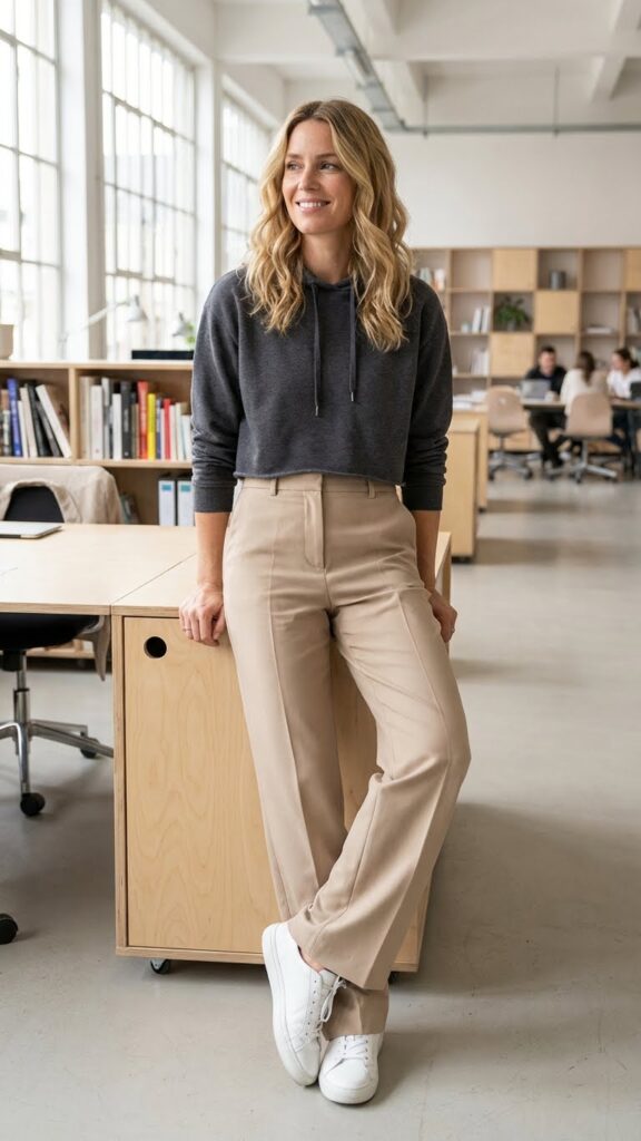 If your office leans more casual-cool, a cropped hoodie is your new best friend. Pair it with high-waisted wide-leg pants or even tailored culottes for a silhouette that’s equal parts trendy and office-appropriate. The higher rise keeps everything looking intentional (and HR-approved).