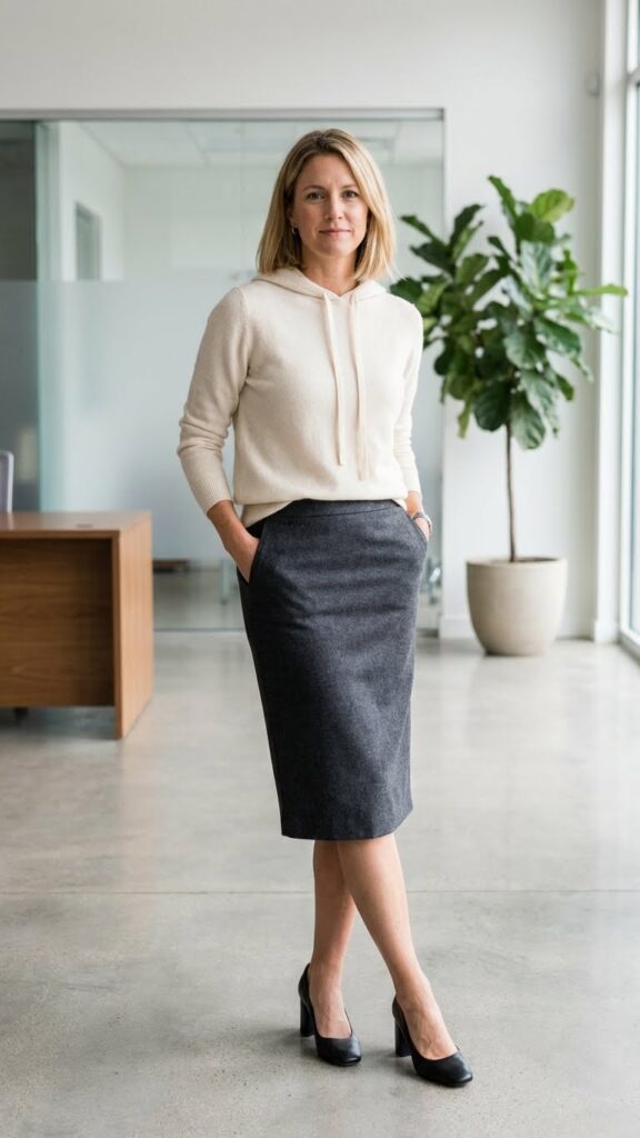Keep the color palette sophisticated. Black, navy, or burgundy pencil skirts work beautifully with cream or gray hoodies. Finish with pumps or block heels. This one’s for the bold dressers who love mixing vibes and making people wonder, “Wait, is that a hoodie?” Yes. Yes, it is.
