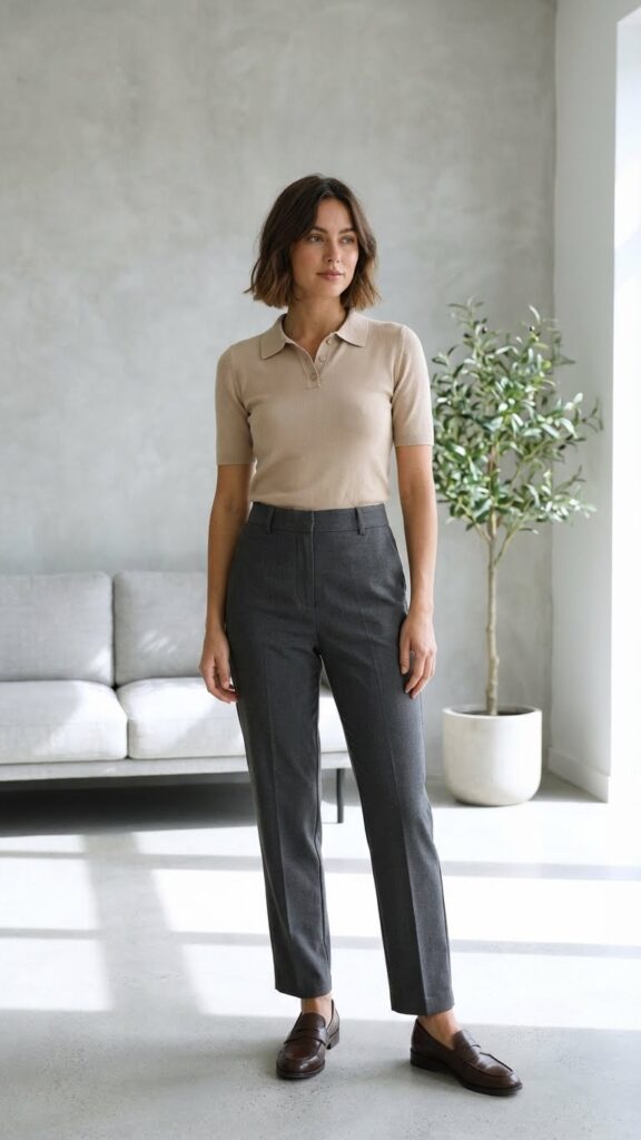 Choose a polo in a solid neutral—black, navy, or cream work beautifully. The collar adds structure without feeling as formal as a button-down, which is perfect for business-casual environments. Pair with tailored pants and loafers for a look that says “I’m professional but I also have a life outside this office.” Add a leather watch or simple bracelet to complete the vibe. This outfit is great for days when you need to move around a lot but still want to look put-together. Way better than a wrinkled button-down, trust me.