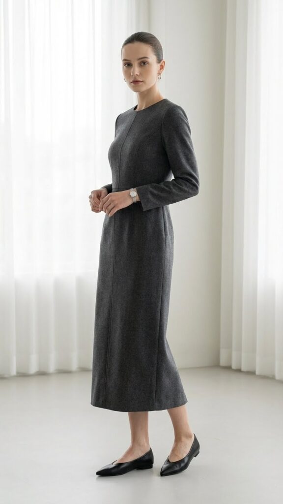 The Japanese approach to dressing avoids anything too tight or too loose—we want structure that flatters without clinging. A sheath dress or shift dress in navy, black, or charcoal works perfectly. Keep accessories minimal: small stud earrings, a delicate necklace, and a classic watch. Add simple pumps or flats, and you’re done. This outfit is the ultimate time-saver for mornings when you hit snooze one too many times. Plus, it eliminates the mental load of coordinating separates. Is it even Monday if you’re not reaching for the easy option?