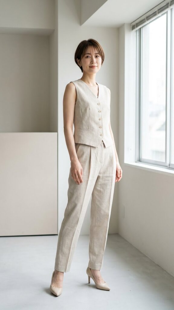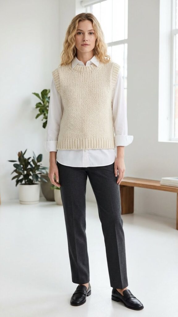 This outfit works because of the waist definition—high-waisted pants elongate your legs, and the vest creates a clean vertical line. Add a simple blouse or turtleneck underneath if you need more coverage, or rock it solo with a delicate necklace if your office vibe allows. Finish with pointed-toe heels or sleek flats. I once tried pairing this with sneakers… let’s just say it didn’t hit the same. This look is ideal for important meetings when you want to channel “sophisticated professional who definitely has a five-year plan.”
