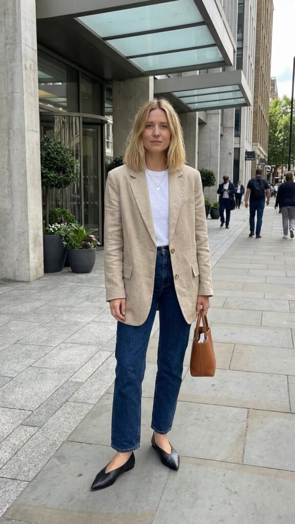 The blazer should be structured but not stuffy. Think soft shoulders and a slightly oversized fit that feels modern. Roll up the sleeves for that “I’m approachable but still professional” vibe. Finish with pointed-toe flats or low-heeled mules, and maybe a simple leather tote. This outfit is perfect for those days when you have back-to-back Zooms but also need to feel human. IMO, it’s the sweet spot between polished and comfortable ✨