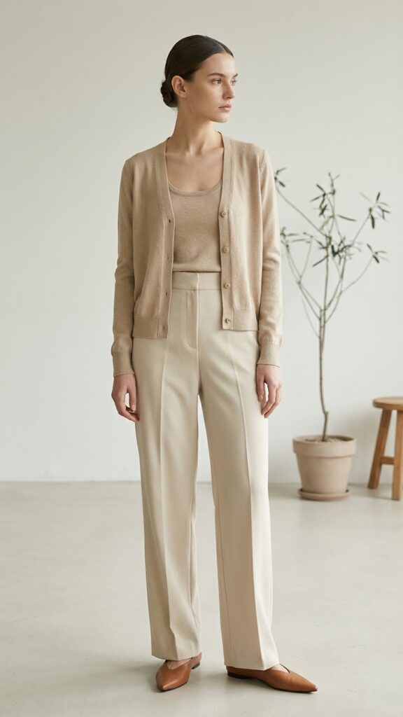 Go for a fine-knit set in a neutral shade. The cardigan should button up (not wrap) for that clean, structured look. Pair with tailored trousers or a pencil skirt, and add simple accessories. The beauty of this outfit is that you can wear the pieces separately too—the cardigan over a button-down, the tank with jeans on the weekend. It’s minimal, polished, and requires approximately zero styling decisions. Some people swear by bold colors here, but keeping it neutral maintains that Japanese-inspired clean aesthetic we’re after.