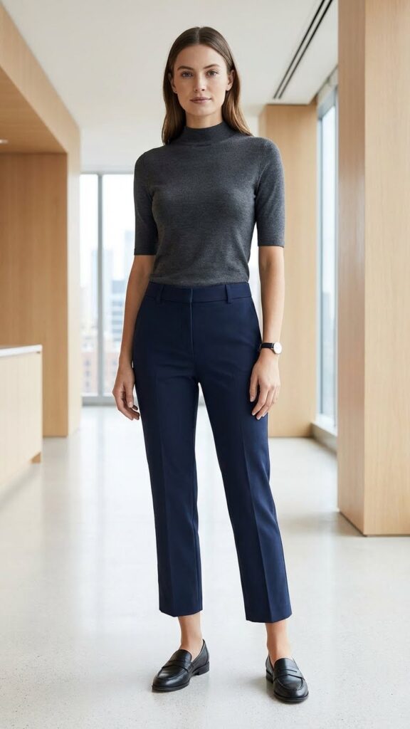 Choose a mock neck in a solid color and tuck it into your trousers to define your waist. The cropped length shows off your shoes, so this is your chance to make a subtle statement with interesting loafers or heeled mules. Add a structured tote and minimal jewelry—we’re keeping it clean, remember? This outfit is perfect for those in-between weather days when layers feel too heavy but you still need long sleeves. Plus, it photographs really well if you have to be on camera all day (not that any of us are tired of Zoom meetings or anything).