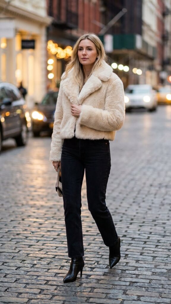 A faux fur coat adds incredible fabric texture and instant glamour to your look. Choose a cropped or mid-length style that hits at your hip or thigh. This creates beautiful proportions and keeps you warm during chilly evenings out.