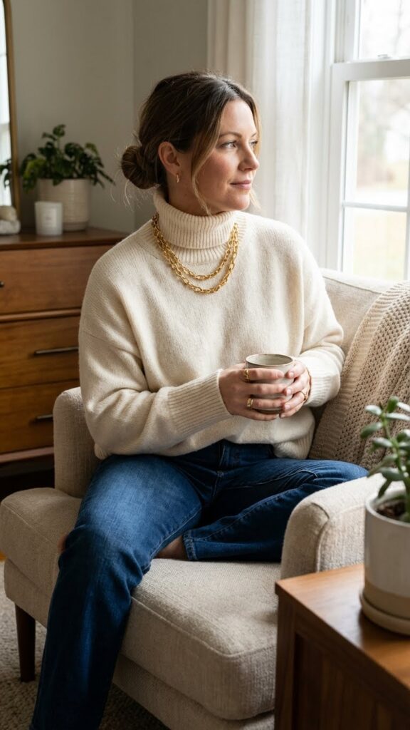 The key to elevating this outfit lies in versatile accessorizing. Bold statement earrings or a chunky gold necklace instantly changes your casual base into something special. You’ll want to choose pieces that catch the light and draw attention upward toward your face.