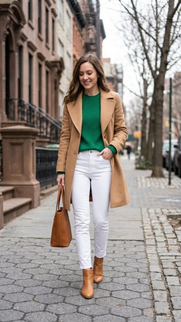 The color combination of white denim with a bold sweater creates visual interest that’s perfect for romantic evenings. Choose jewel tones like emerald, ruby red, or cobalt blue to add warmth and personality. Your camel coat ties everything together with timeless elegance.
