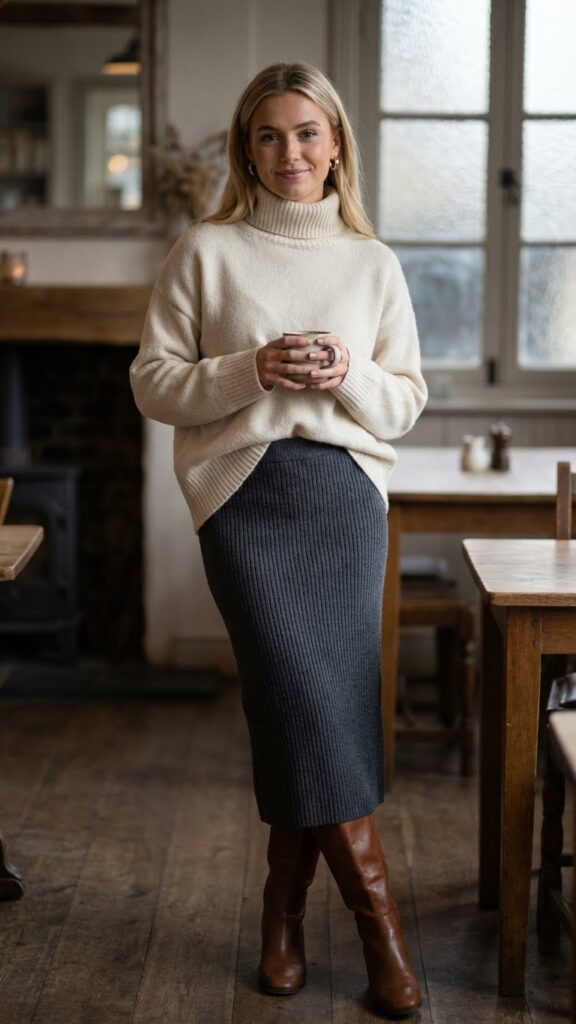 When temperatures drop, pairing a chunky turtleneck sweater with a ribbed midi knit skirt creates one of winter’s most stylish and practical combinations.