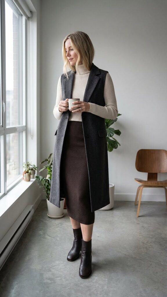 When you’re looking to add sophisticated layers to your winter wardrobe, a long vest draped over a slim-fit knit pencil skirt creates an instantly polished silhouette. This combination gives you freedom to move while maintaining a sleek minimalist look that works from office to evening outings.