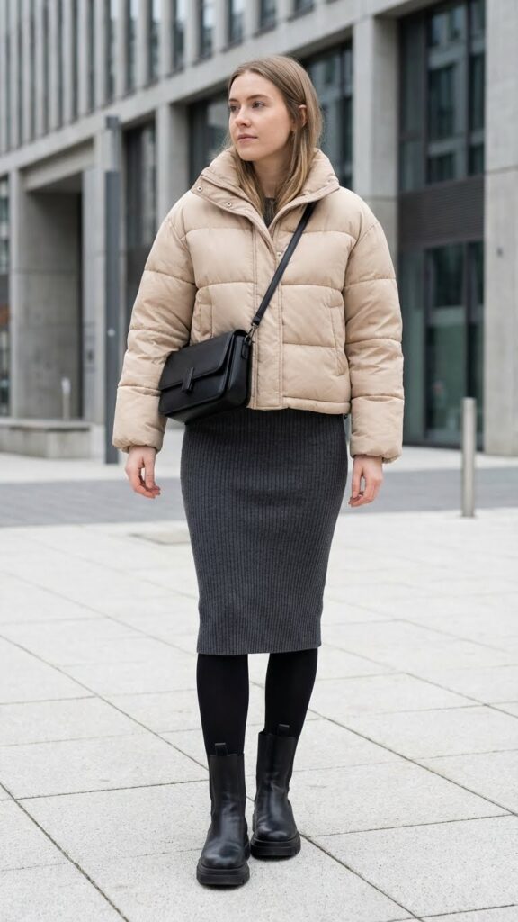 Although puffer jackets might seem too casual for a polished look, pairing a cropped version with a fitted knit pencil skirt creates an unexpectedly chic winter outfit. This combination gives you a modern silhouette that balances volume on top with sleek lines below. You’ll stay warm without sacrificing your personal style or freedom of movement.