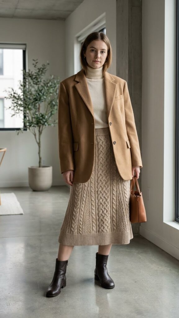 Because an oversized blazer naturally creates a relaxed yet refined aesthetic, it pairs beautifully with the textured charm of a cable-knit A-line skirt. This combination gives you the freedom to move comfortably while maintaining a chic style silhouette that works anywhere.