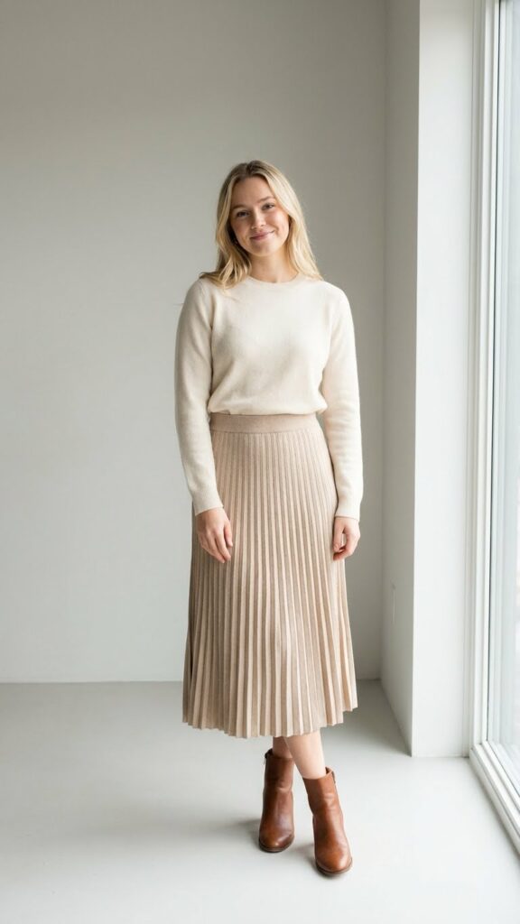 Choose a high waisted pleated skirt that sits comfortably at your natural waistline. The pleats add movement and visual interest, preventing your outfit from feeling restrictive. A midi length works beautifully here, offering warmth while allowing you to express your personal style.