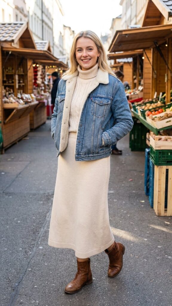 Sherpa-Lined Denim Jacket Over a Neutral Knit Midi Skirt
