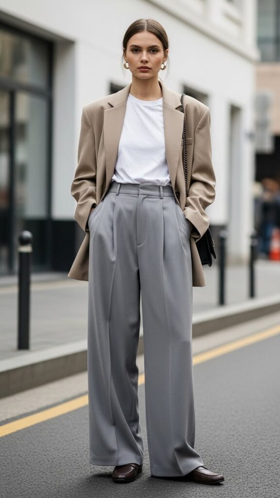 Throw a simple white tee underneath your oversized blazer and let the proportions do all the talking. The wide leg trousers should hit right at or just above your ankle for that perfect crop. Finish with loafers or simple sneakers. IMO this look is peak sophisticated without trying too hard ✨
