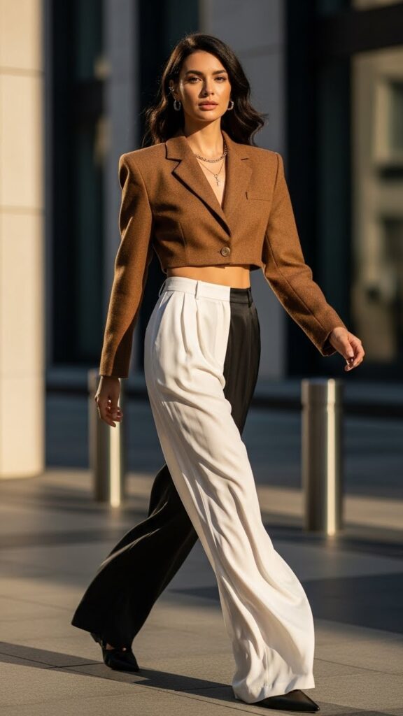 The cardigan should hit right at your natural waist, and bonus points if you wear it buttoned all the way up with nothing underneath. It’s giving main character energy, honestly. Your pleated trousers add movement and visual interest, especially in a contrasting color.