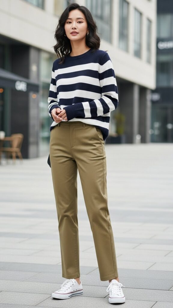 Nautical vibes but make it Seoul street style. A striped sweater in classic navy and white paired with straight leg trousers gives you that clean, youthful energy Korean fashion does so well.
