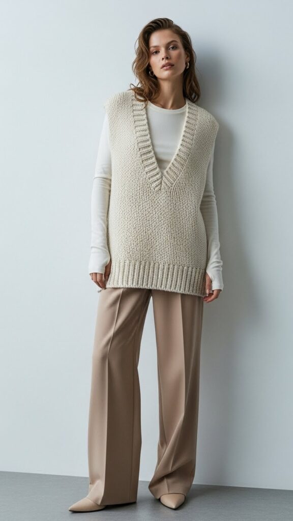 Start with a fitted long sleeve tee as your base, then add a chunky knit vest in a complementary color. Wide leg or straight leg trousers both work here, so go with whatever silhouette you love most. The layering adds visual depth without making you look like you’re wearing seventeen pieces of clothing.