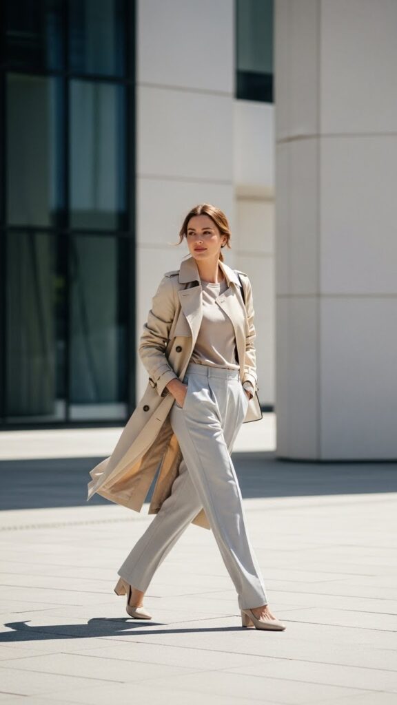 Go for neutral trousers in tan, cream, or light gray, then layer a classic trench coat that hits mid thigh or below. Keep everything underneath simple. A plain tee or thin knit sweater works perfectly. The trench does all the heavy lifting style wise.