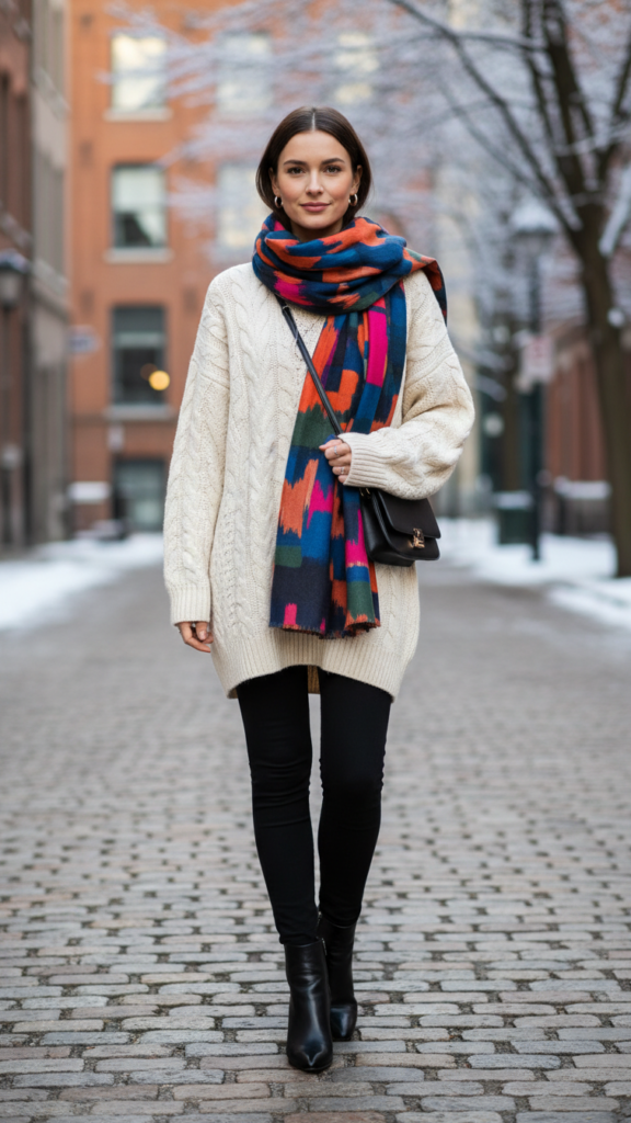 Transform this basic foundation with statement accessories that reflect your personality. Wrap a colorful printed scarf around your neck, letting the ends cascade naturally. These cozy layers work together to create visual interest while keeping you warm. Black leggings serve as the perfect base for winter styling because they complement any color palette while maintaining a polished appearance. Add a crossbody bag and delicate jewelry to complete your effortlessly chic winter look.