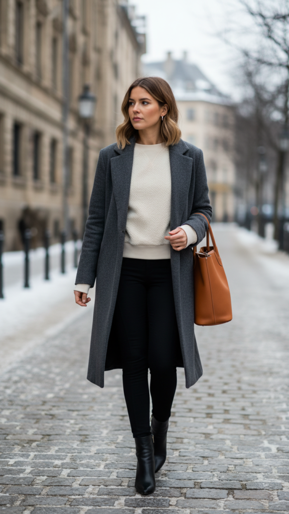 Enhance this look with layered accessories such as a delicate scarf tucked inside your coat or a structured handbag. Add a thin belt around your coat’s waist to define your silhouette. This versatile outfit works perfectly for office settings, casual meetings, or weekend errands when you want to look polished yet approachable.