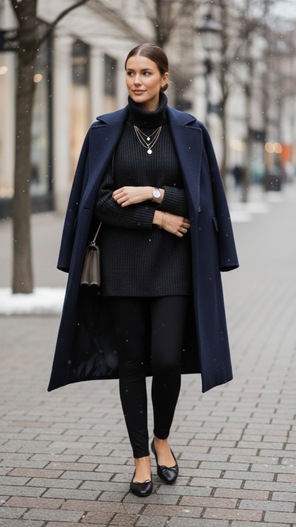 Pairing up a classic turtleneck sweater with a structured wool coat and comfortable ballet flats creates an effortlessly chic winter ensemble that’s both practical and refined. This combination gives you the freedom to move gracefully while staying warm during colder months.