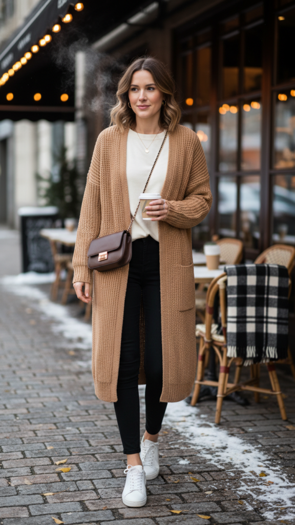 Choose a cardigan that hits mid-thigh or longer for ideal coverage and flattering proportions. Neutral colors like cream, gray, or camel offer maximum mixing potential with your existing wardrobe pieces. The beauty of this cozy layering approach lies in its adaptability—you can dress it up with ankle boots or keep it casual with clean white sneakers.