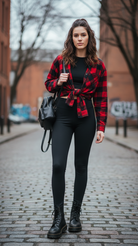 Grunge-inspired style meets feminine silhouettes in this edgy winter outfit that alters your basic leggings into a statement look with attitude. You’ll love how cozy flannel layers create warmth while maintaining that rebellious vibe you’re craving this season.