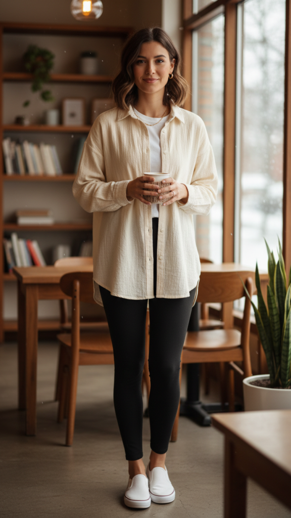 The relaxed silhouette of an oversized shirt naturally balances the fitted nature of leggings, creating visual interest without feeling restrictive. Choose crisp white cotton or soft flannel in neutral tones like cream, sage, or dusty blue for maximum versatility. Slip-on shoes like canvas sneakers, leather loafers, or ankle boots keep the look streamlined and practical. Cozy leggings serve as the perfect foundation for building comfortable winter outfits that prioritize both warmth and style.