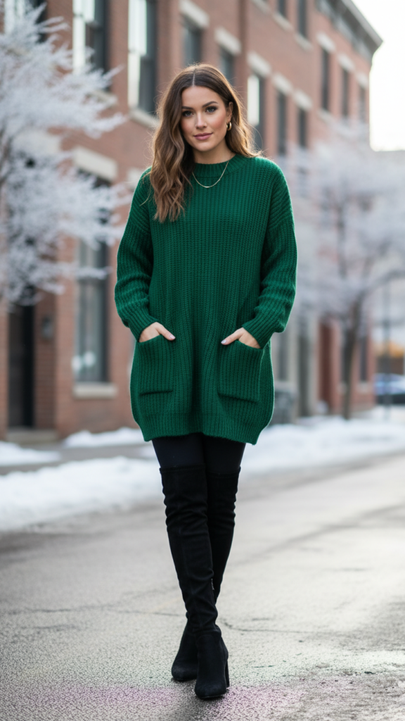 Choose bold colors like emerald green, deep burgundy, or rich navy to make a striking statement against winter’s neutral backdrop. The sweater dress should hit mid-thigh when paired with fitted leggings underneath. Over-the-knee boots create a sleek silhouette while providing essential leg coverage and warmth.