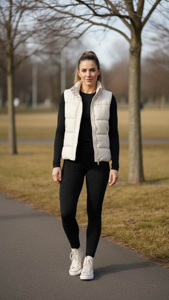 The puffer vest layered over a long-sleeve tee creates a perfect athletic-casual winter look that balances warmth with mobility. This combination gives you the freedom to move while staying cozy and stylish throughout your day.