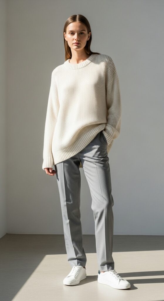 This combo is what I call “effort without effort.” An oversized cream sweater tucked loosely into light gray trousers creates that relaxed silhouette everyone’s obsessing over right now. Add clean white sneakers, and you’ve got weekend perfection.