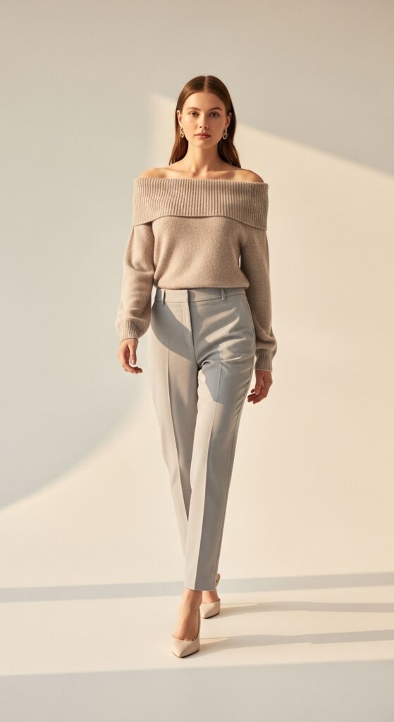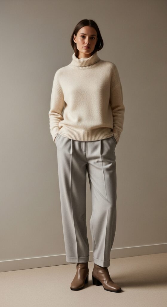 For cooler days, a cashmere turtleneck in cream or soft camel with light gray trousers is pure sophistication. Ankle boots in taupe or tan ground the look while keeping it seasonal.