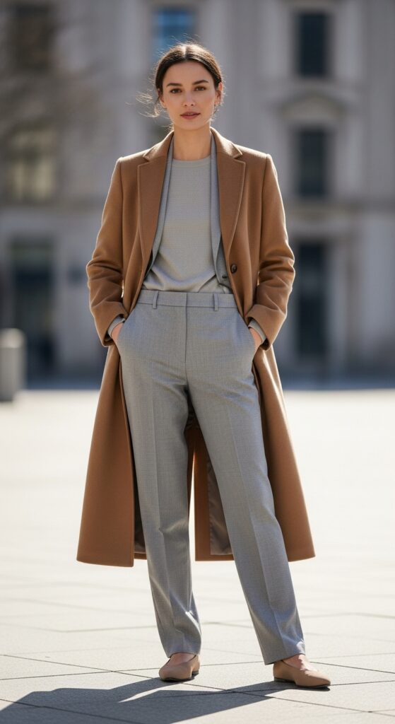 When temperatures drop, a longline coat in camel, cream, or matching gray over light gray trousers creates that effortlessly elegant silhouette. Minimalist flats keep the look grounded and walkable.