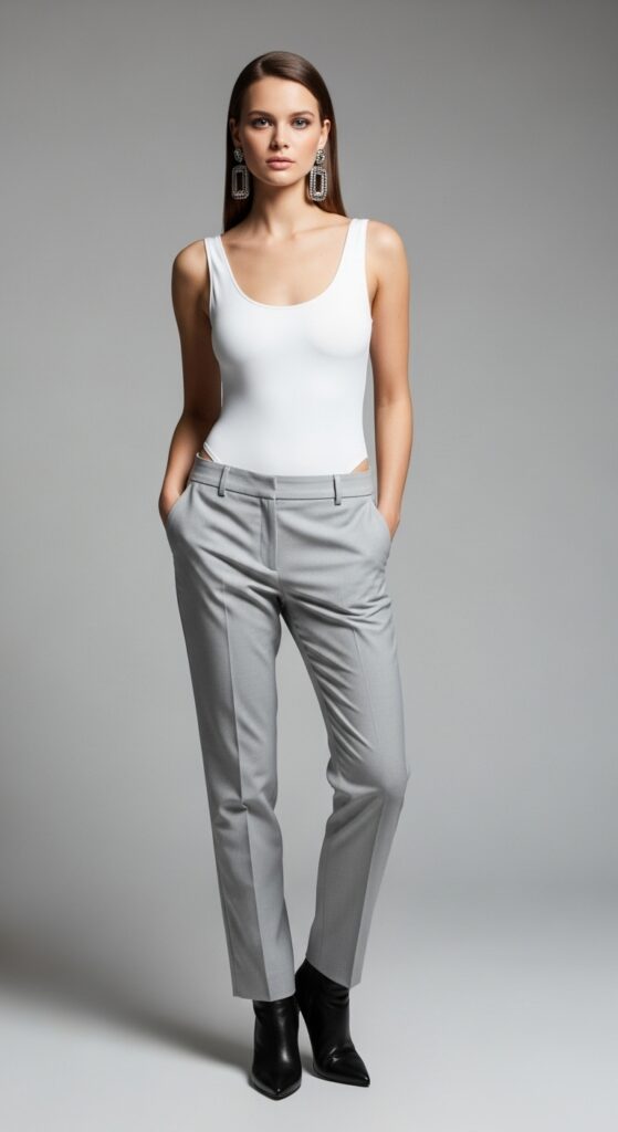 For a sleeker option, a tucked bodysuit in white or nude creates the cleanest line with light gray trousers. No bunching, no untucking. Just smooth, streamlined perfection.