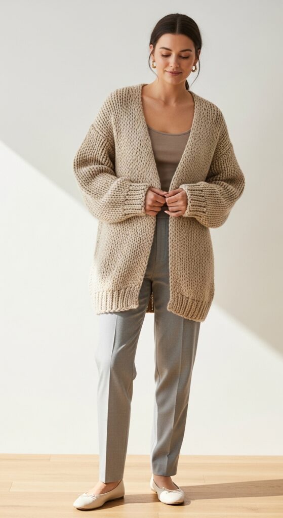 Cardigan season is the best season, and I will die on this hill. A chunky knit cardigan in oatmeal or soft beige over light gray trousers gives you that cozy wrapped up feeling without sacrificing style. Ballet flats keep it feminine and grounded.