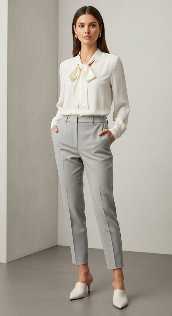 When you need to look polished but still want that understated elegance, reach for a silk blouse in ivory or soft blush. The fabric’s natural sheen plays beautifully against matte gray trousers. Pointed toe mules add just enough sophistication without veering into corporate territory.
